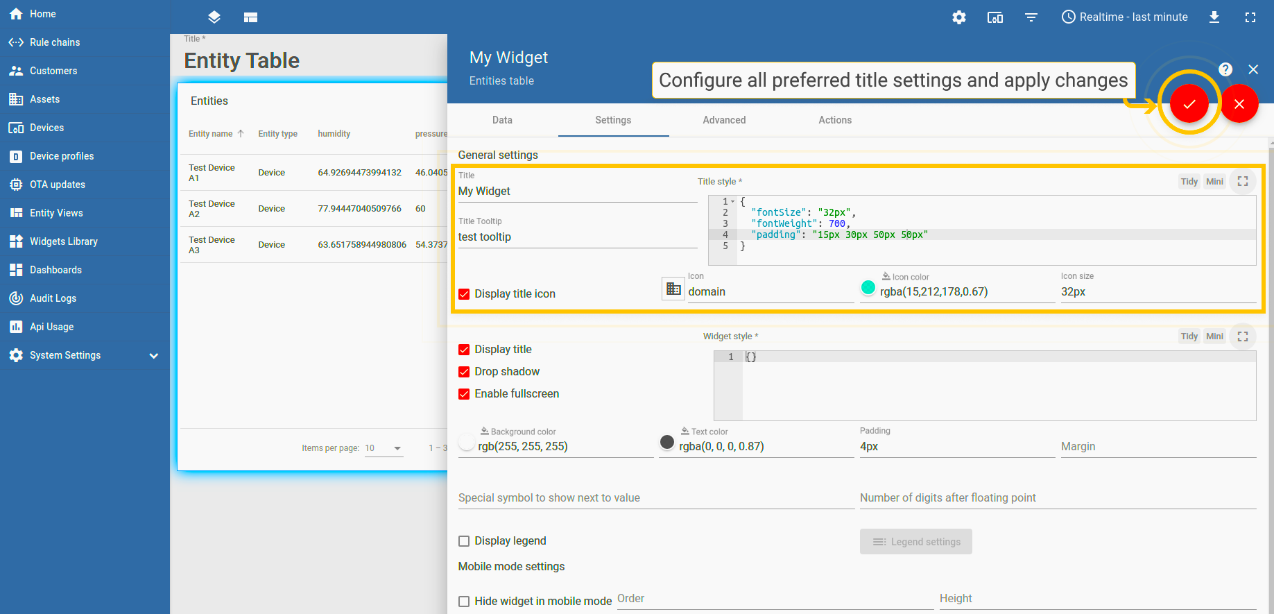 下一步是可视化遥测。要将实体表小部件添加到仪表板,您应该: