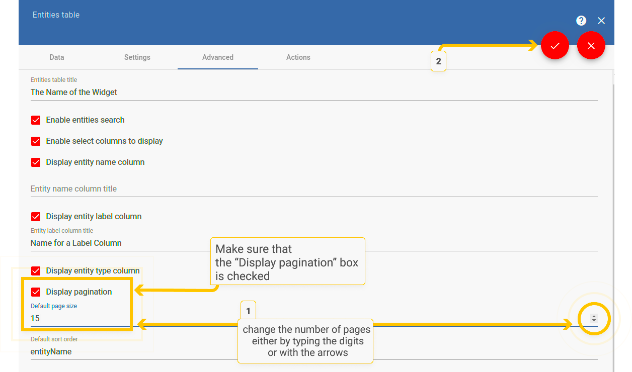 默认情况下,小部件显示每页有多少个可见项目以及一般有多少页。显示此信息是可选的。它通过选中/取消选中“显示分页”复选框来更改。如果禁用该复选框,则不会显示有关每页项目和页数的信息。要应用更改,请单击右上角的橙色复选标记。