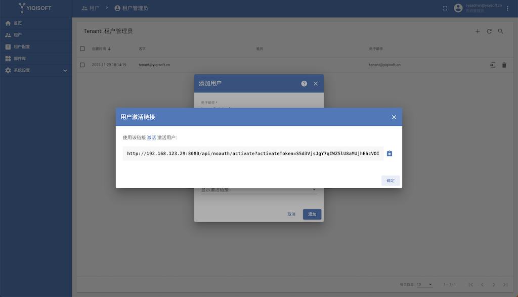 2) 显示激活链接将显示租户管理员用户的激活链接。