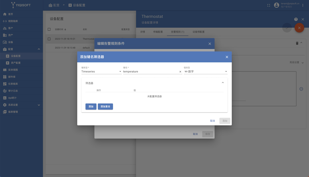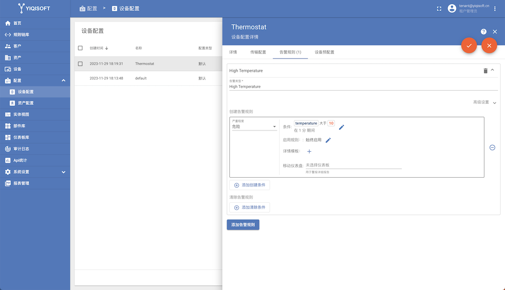 平台用户可以使用规则引擎来配置警报。规则引擎是一个相当强大的功能,但它需要一些编程技能。从 YiCONNECT 3.2 开始,我们引入了警报规则来简化配置最流行警报类型的过程。现在您不需要成为规则引擎专家来配置您的处理逻辑。在底层,规则引擎使用“设备配置文件”规则节点评估警报规则。