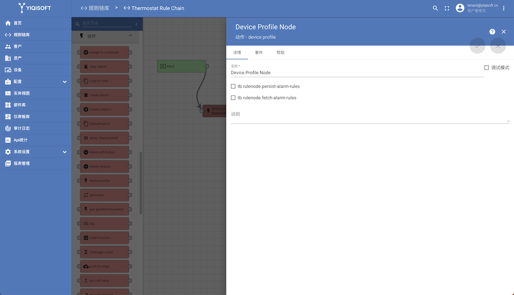 设备配置文件规则节点根据设备配置文件中定义的警报规则创建和清除警报。默认情况下,这是处理链中的第一个规则节点。规则节点处理所有传入消息并对属性和遥测值做出反应。