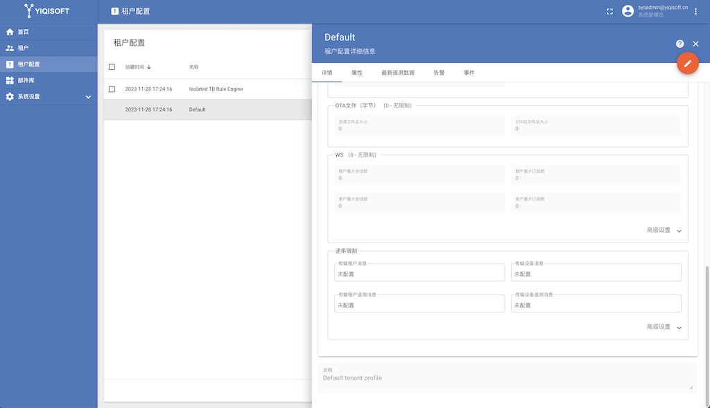 YiCONNECT支持以下实体的限制:设备、资产、客户、用户、仪表板和规则链。